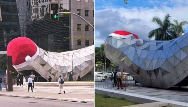 A escultura metálica de baleia que identifica a entrada do Teatro B32, na Avenida Faria Lima, ganhou nova decoração natalina depois que o primeiro enfeite instalado repercutiu por se assemelhar a um órgão sexual masculino. O acessório — um chapéu vermelho de Papai Noel colocado no início da semana — cobriu grande parte da peça e rapidamente virou assunto de comentários nas redes sociais.