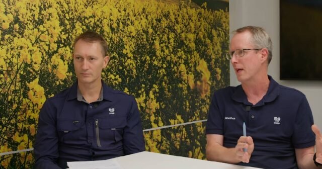 A CSBP Fertilizers produz um vídeo regular de atualização do mercado para fornecer aos produtores de WA as últimas notícias globais e locais sobre fertilizantes. Desde que a atualização de mercado mais recente foi filmada com os gerentes da cadeia de suprimentos Mark Robinson (à esquerda) e Jonathan Hams, houve um desenvolvimento nos mercados globais de fosfato. Imagem fornecida.